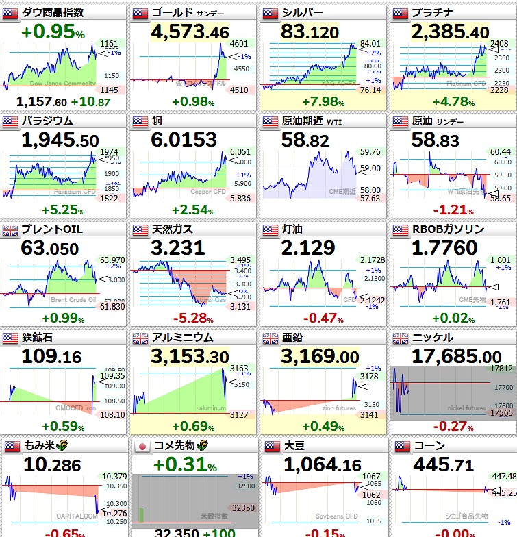 金価格の高騰が長い間続いていましたが、ついに銀価格が急上昇するなど商品相場全体がグングンと上昇しています。(と書いていましたら本日2026/1/15銀価格急落、世界の株価のチャートが壊れて見れなくなりました)